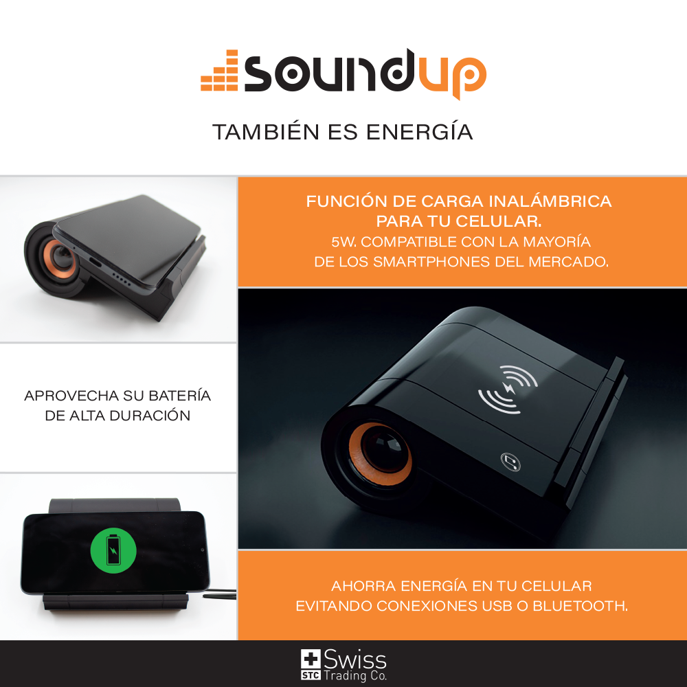SoundUp no solo amplifica el sonido de tu teléfono, también lo mantiene cargado mientras disfrutas de tu contenido. Su base de carga inalámbrica integrada te permite olvidarte de los cables y enchufes innecesarios. Compatible con todos los smartphones que admiten carga inalámbrica por inducción, SoundUp es el compañero perfecto para quienes buscan comodidad y funcionalidad en un solo dispositivo. Solo coloca tu celular sobre la base y deja que la magia suceda.
